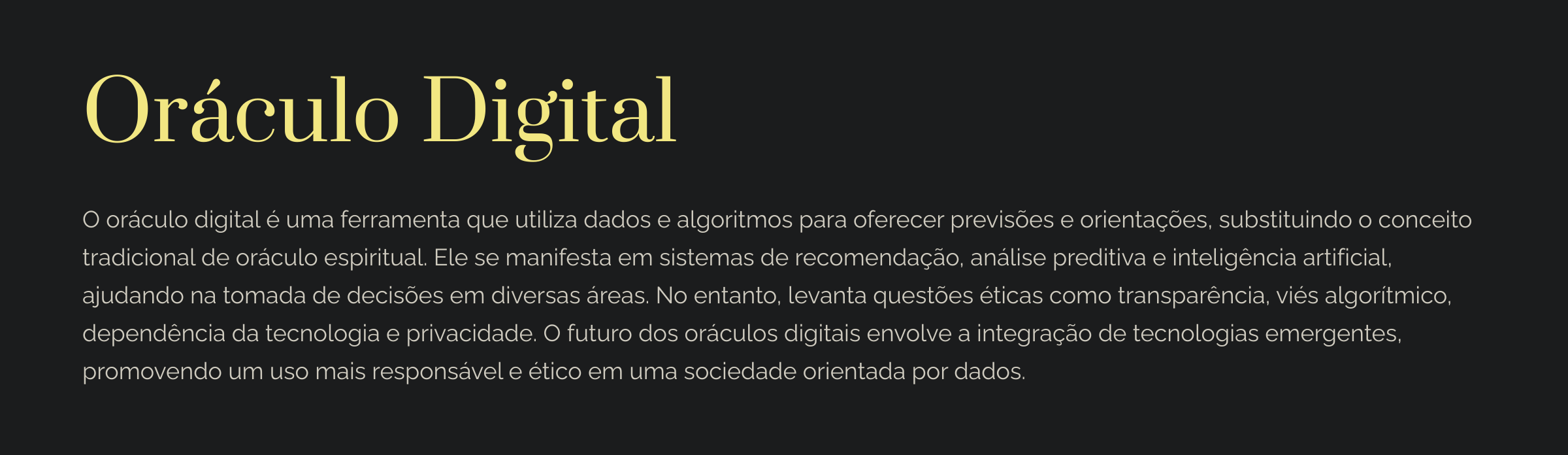 Por fim, o oráculo digital pode ser visto não apenas como uma ferramenta para previsão e orientação, mas também como um reflexo das complexidades e desafios da sociedade contemporânea. Ele nos desafia a considerar como as decisões são tomadas, quem detém o poder sobre as informações e como podemos navegar em um mundo cada vez mais orientado por dados.