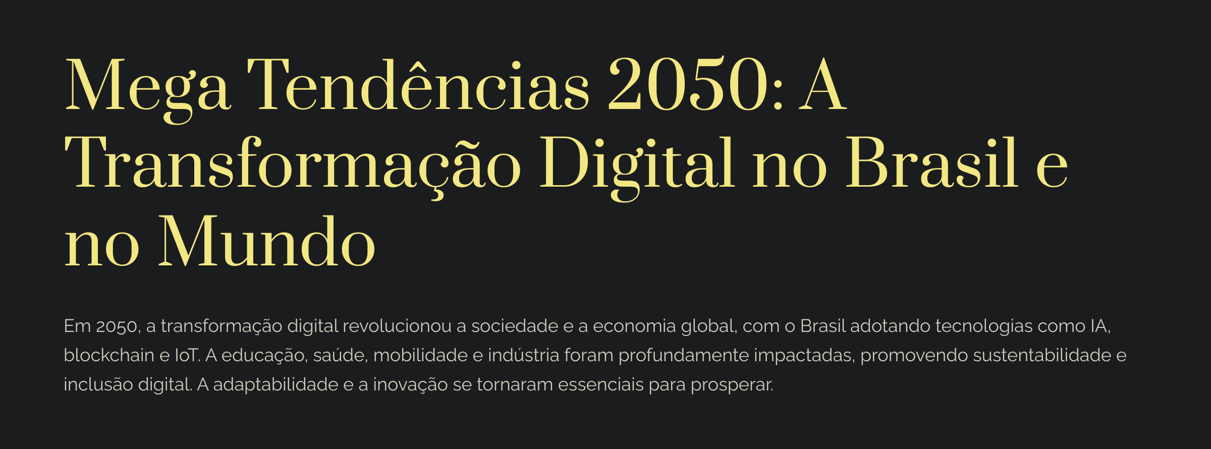 No ano de 2050, a transformação digital atingiu um patamar sem precedentes, moldando a sociedade e a economia global. O Brasil, como muitos outros países, experimentou mudanças profundas em suas estruturas sociais e econômicas. As mega tendências que começaram a emergir nas décadas anteriores floresceram, criando um cenário futurístico que hoje parece mais uma realidade inevitável do que uma previsão distante. As tecnologias disruptivas, como a inteligência artificial (IA), blockchain, e a Internet das Coisas (IoT), transformaram cada aspecto da vida cotidiana, desde a educação até a saúde e a maneira como trabalhamos.